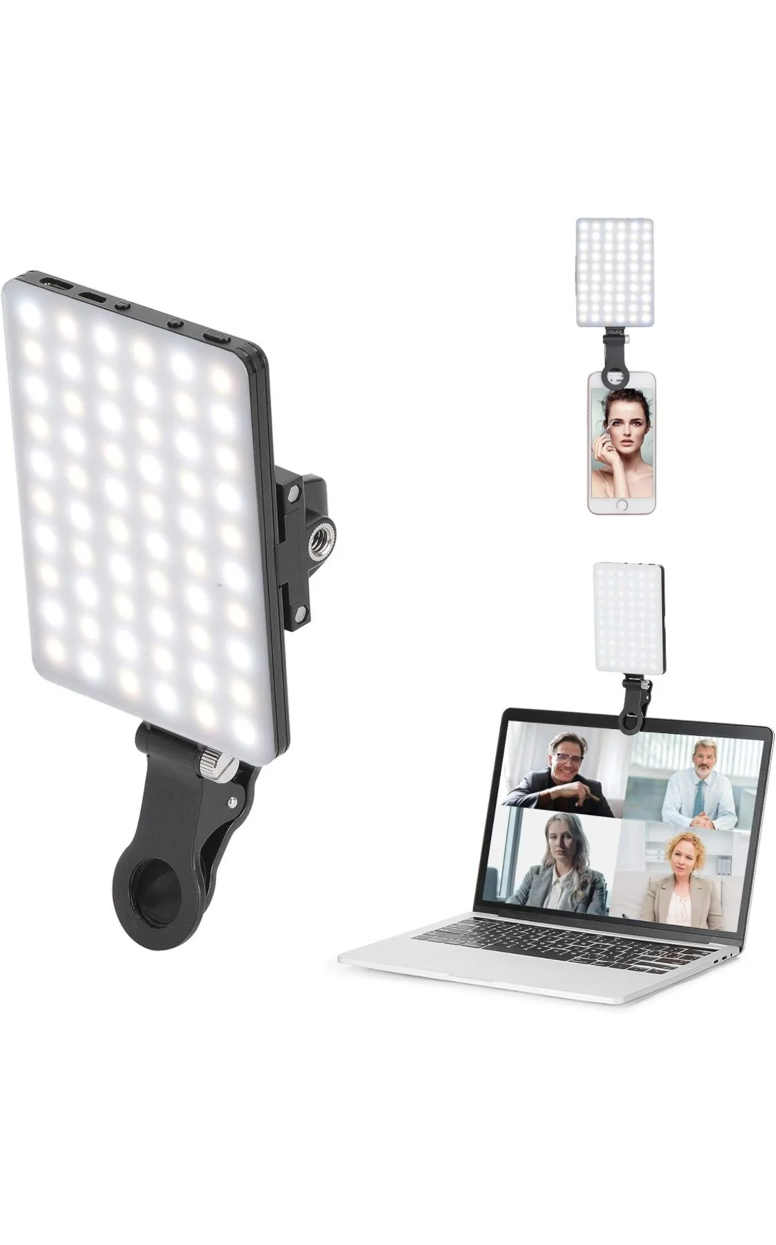 Newmowa 60 LED High Power Rechargeable Clip Fill Video Conference Light with Front & Back Clip, Adjusted 3 Light Modes for Phone, iPhone, Android, iPad, Laptop, for Makeup, TikTok, Selfie, Vlog.